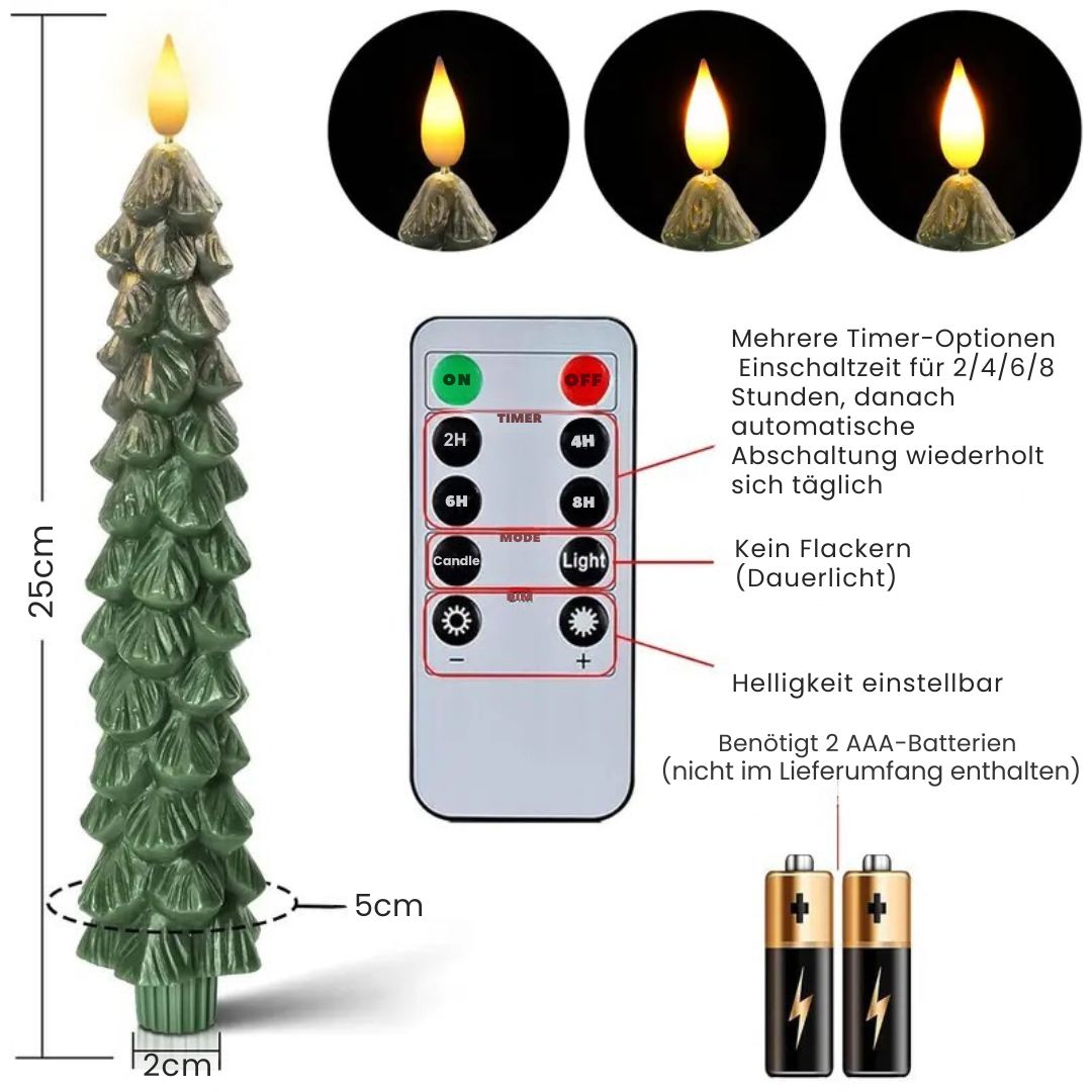 Unsere Tannenlichter aus Wachs bringen echte Kerzenstimmung – ohne Feuer, Rauch oder Kabel. Mit Fernbedienung und Timer steuerst du das sanfte Flackern ganz bequem. Das natürliche Wachsdesign fügt sich elegant in jede Deko ein und sorgt für eine gemütliche Atmosphäre.
